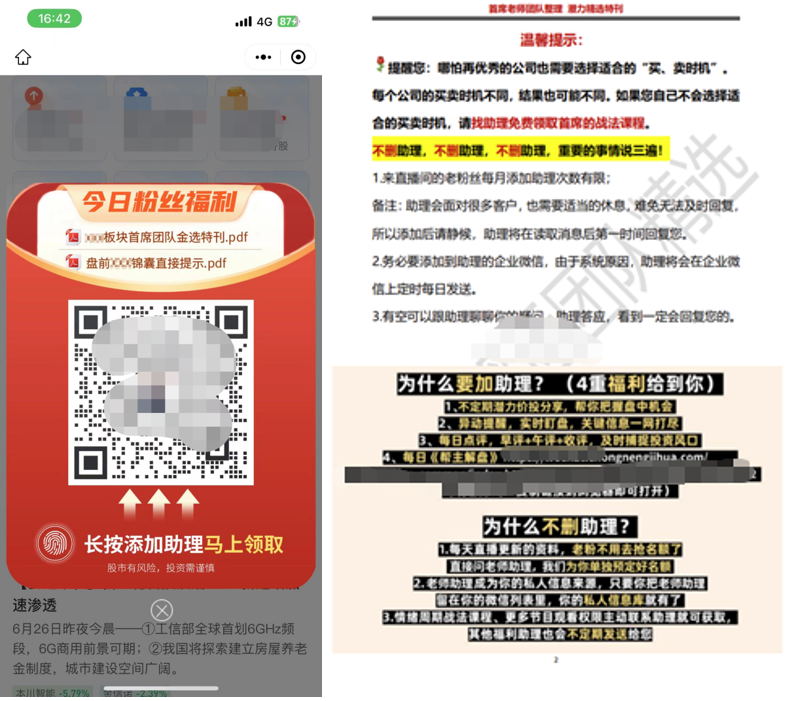 2021年年底,深圳證監(jiān)局發(fā)文指出,“非法薦股”活動特點(diǎn)包括:以夸張宣傳招攬客戶。不法分子通過電話、直播間、微信群、微信公眾號、QQ、微博、股吧、論壇、網(wǎng)站等渠道,以“專家一對一診股”、“無收益不收費(fèi)”等夸張性宣傳術(shù)語,或者鼓吹過往炒股“業(yè)績”,招攬會員或者客戶。