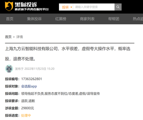 在黑貓投訴平臺中,仍有2022年11月底對九方平臺旗下會選股APP涉及“暗示誘導(dǎo)賺錢”內(nèi)容投訴并要求退款,至今未處理完結(jié)。2021年,會選股APP有約400萬名注冊用戶,2018年至2021年平均月活用戶復(fù)合增長率高達(dá)153%。