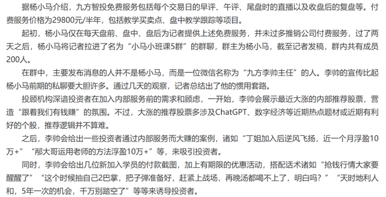 九方財(cái)富于今年3月上市。同月,北京商報(bào)對九方智投進(jìn)行暗訪,當(dāng)記者添加九方財(cái)富企業(yè)微信、通過助理拉入群聊后,群內(nèi)有疑似九方財(cái)富的工作人員通過展示內(nèi)部推薦最近大漲的股票、以及投資者通過內(nèi)部服務(wù)而大賺的案例,吸引投資者。