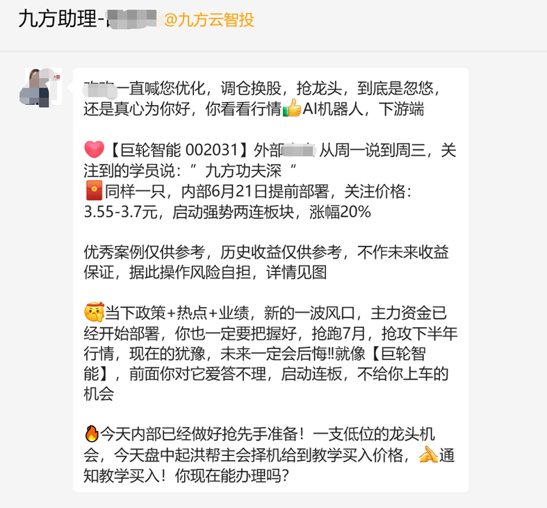 在撰寫本文期間,筆者嘗試掃碼加了九方助理微信,每天也會不定時(shí)收到提及具體股票名稱及漲幅的“盤前提示”,頗具誘惑力。