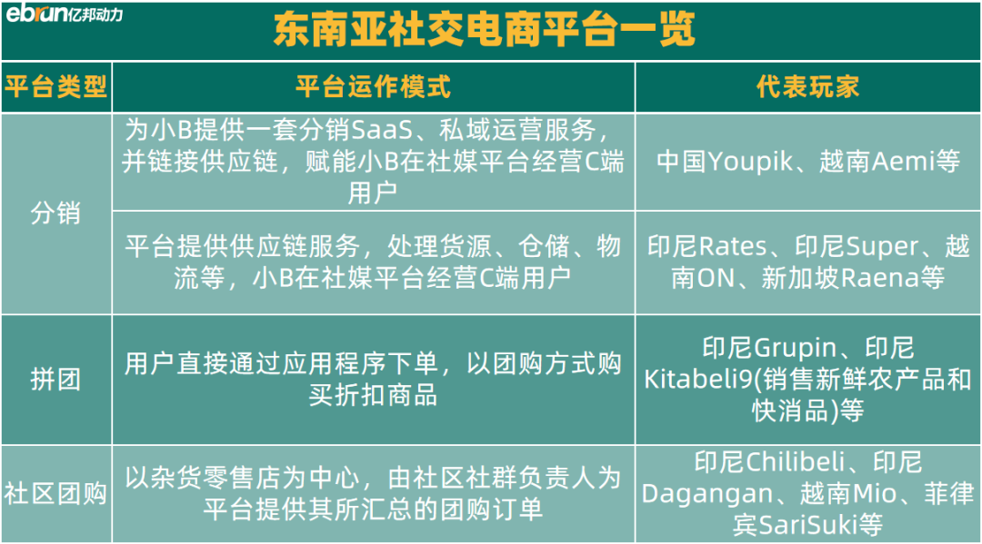 同時,相比歐美成熟市場,東南亞社交流量還處在紅利期,流量成本大約只占歐美的五成不到,因此社交電商成為了本土和外來淘金客的“香餑餑”。目前而言,東南亞社交電商平臺基本為本土企業(yè),基于各自本土供應鏈能力,會涉及分銷、拼團、社區(qū)團購多個類型,帶動本土零售商轉型做電商,而中國玩家則集中在社媒平臺流量端做文章,將中國社交電商能力(分銷SaaS、私域運營服務)復制出海,為本土和出海客戶提供一套流量玩法。