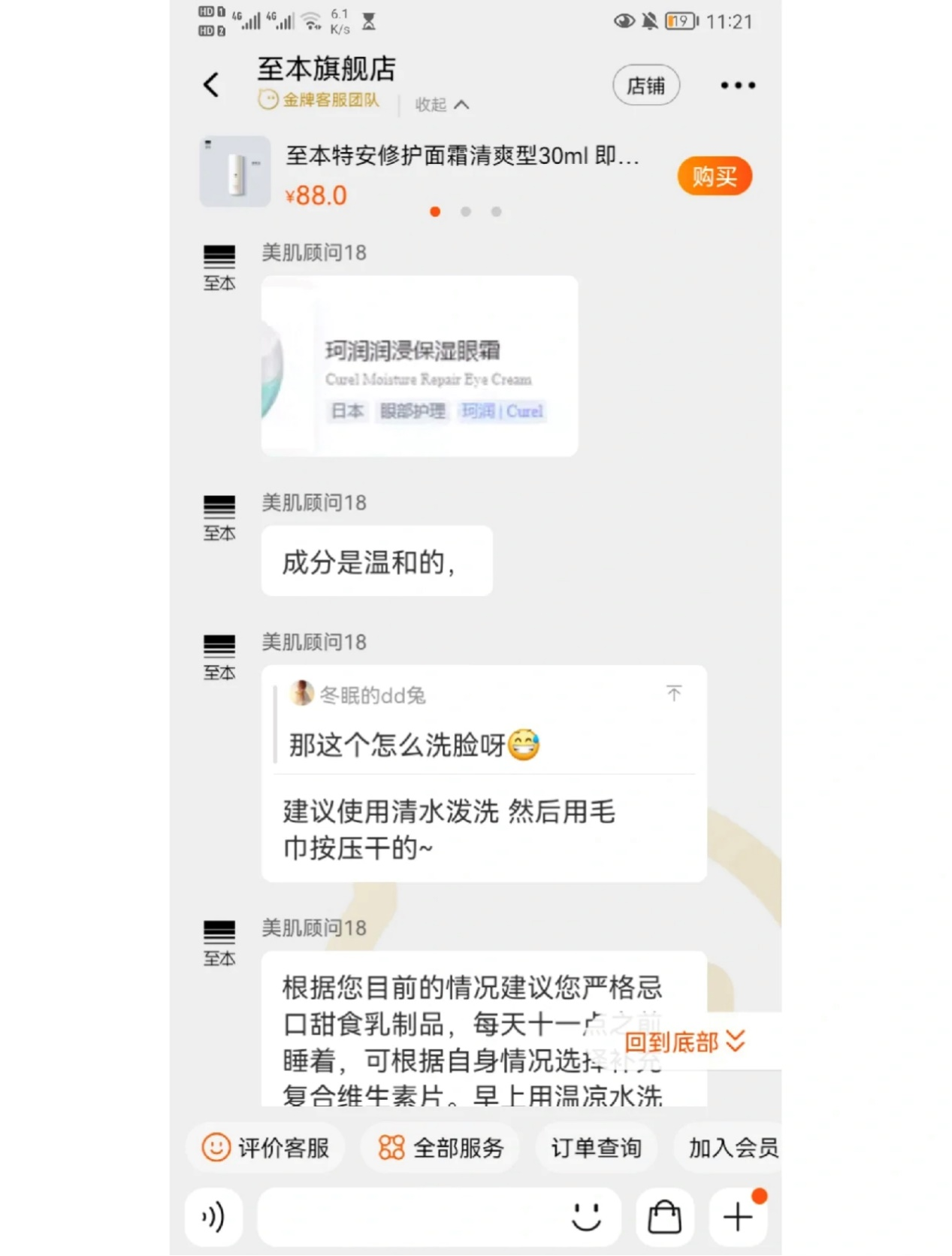 據(jù)子彈財(cái)經(jīng)了解,當(dāng)用戶咨詢時(shí),至本客服不僅會提供皮膚護(hù)理的相關(guān)知識,還會了解用戶正在使用的產(chǎn)品,結(jié)合皮膚問題給出建議,甚至還會給用戶推薦其他品牌的產(chǎn)品,如珂潤、頤蓮、茵芙莎等。
