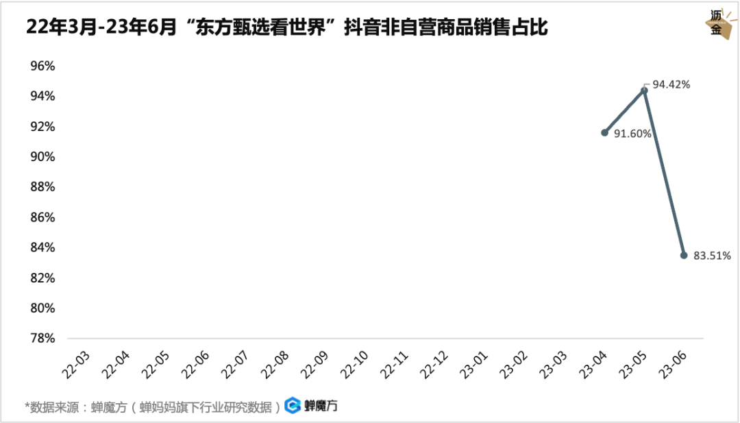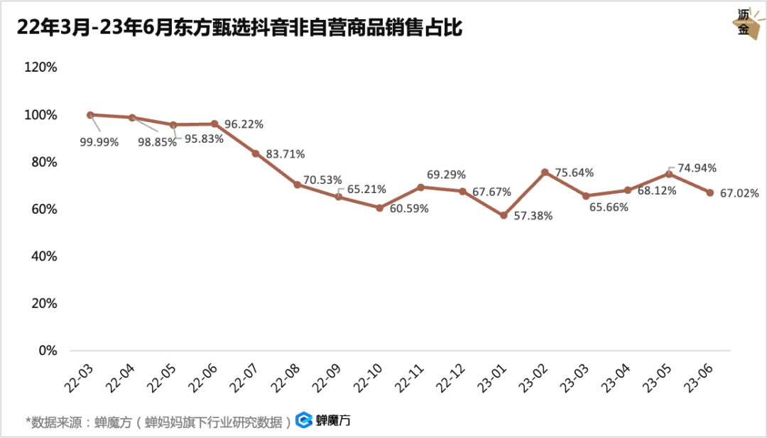 如果統(tǒng)計(jì)2022年3月-2023年6月東方甄選抖音非自營(yíng)商品的銷售占比,會(huì)發(fā)現(xiàn)非自營(yíng)的商品比例持續(xù)下降,而自營(yíng)商品從最開(kāi)始的0逐漸上升到約40%。