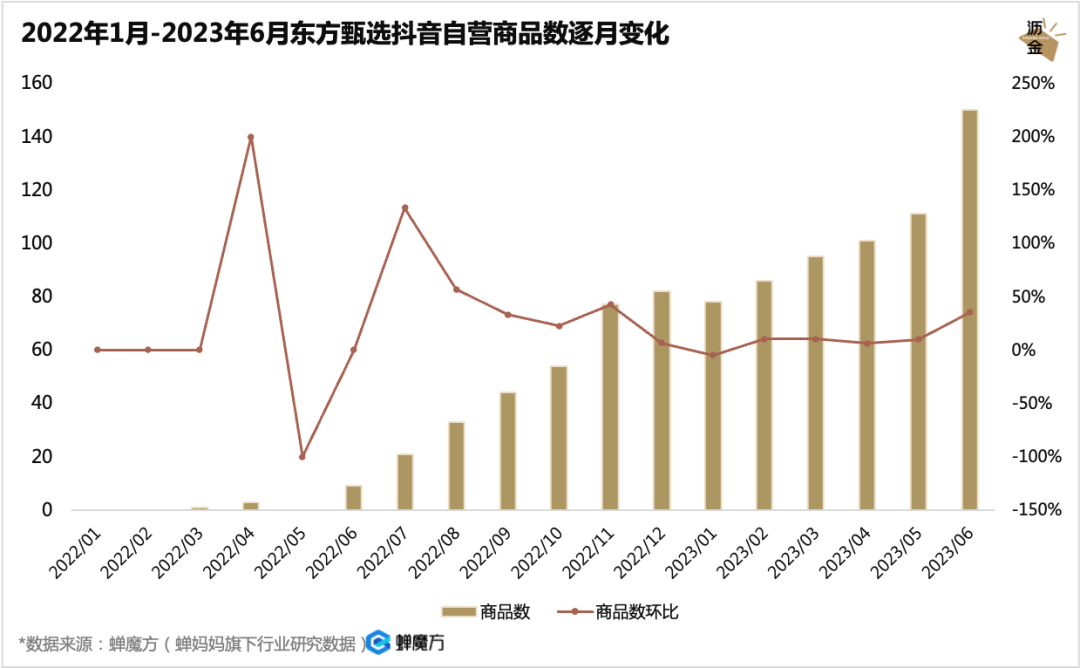 從2022年6月至今,東方甄選的自營(yíng)商品數(shù)始終以一個(gè)相對(duì)平穩(wěn)的速度增長(zhǎng),目前已經(jīng)將近160款一個(gè)月。