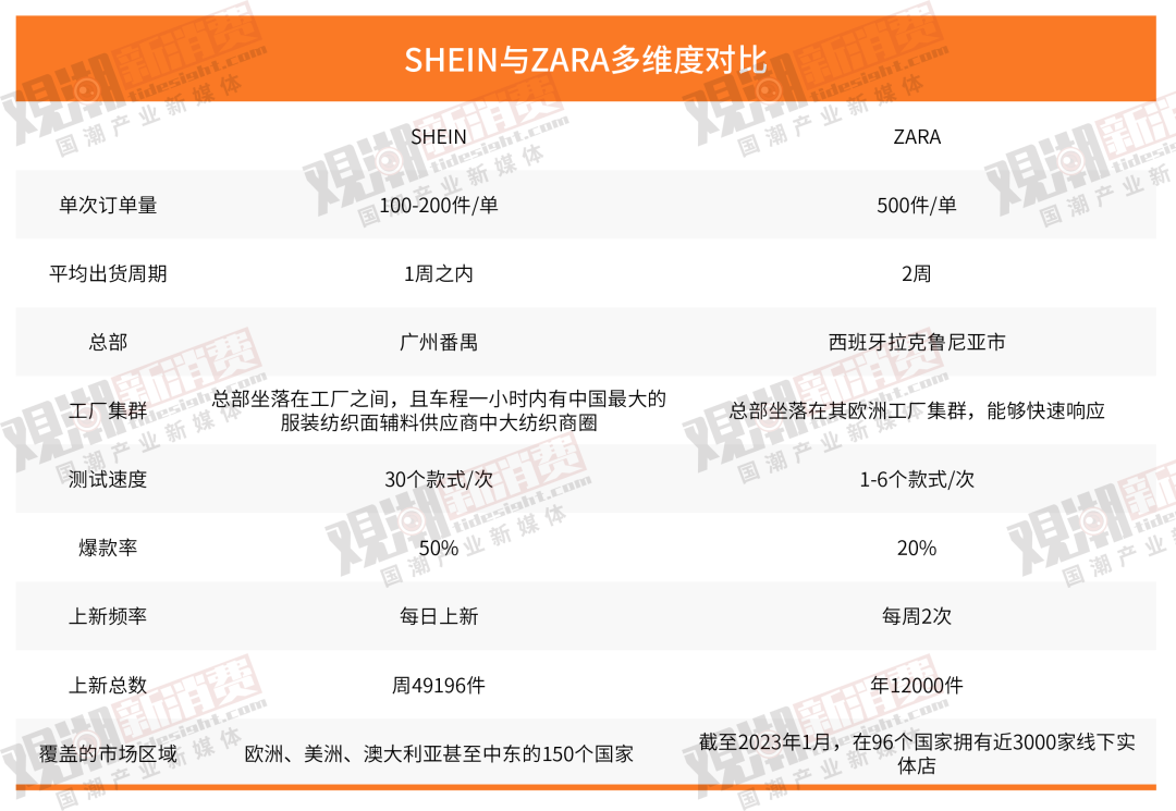 同時(shí),由于SHEIN主營(yíng)線上渠道,因此產(chǎn)品市場(chǎng)測(cè)試的速度為ZARA的5倍左右,意味著同時(shí)間段SHEIN可以測(cè)試更多服裝款式,爆款率也更高。此外,高效且低成本的生產(chǎn)能力是SHEIN能夠跑通小單快返生產(chǎn)模式的有力支撐。2015年,SHEIN將中國(guó)的總部從南京搬到了廣州番禺,那里聚集著一大批服裝中小加工廠,能夠快速適應(yīng)SHEIN的小單快返生產(chǎn)模式。