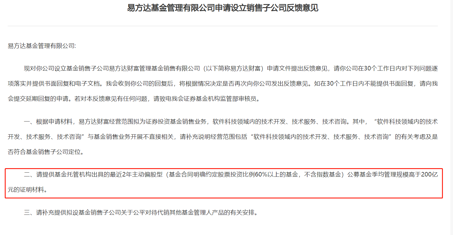 今日,證監(jiān)會(huì)發(fā)布《易方達(dá)基金管理有限公司申請?jiān)O(shè)立銷售子公司反饋意見》(以下簡稱《意見》),文中提到該境內(nèi)子公司為易方達(dá)財(cái)富管理基金銷售有限公司(以下簡稱易方達(dá)財(cái)富)。