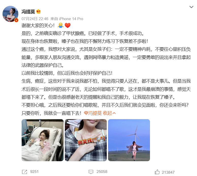 “這是假的吧”,他第一反應(yīng)這又是針對馮提莫的一次尬黑惡作劇,直到40分鐘后,他的特別關(guān)注——馮提莫,發(fā)布長文承認自己確實罹患甲狀腺癌,但現(xiàn)在已經(jīng)在恢復(fù)中。