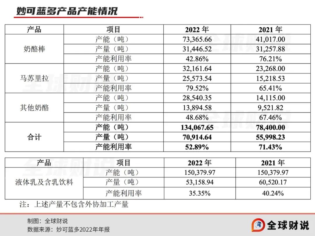 更重要的是,通過財(cái)報(bào)披露表格便可以看出,其實(shí)早在2021年,妙可藍(lán)多的產(chǎn)能利用率便處于不飽和狀態(tài)。