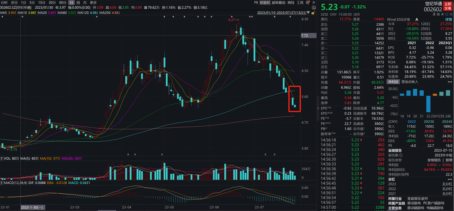反映在資本市場上,次日世紀華通收跌2.8%,此后延續(xù)下滑的趨勢,27日股價報收5.23元/股,市值跌破400億大關,目前390億元。