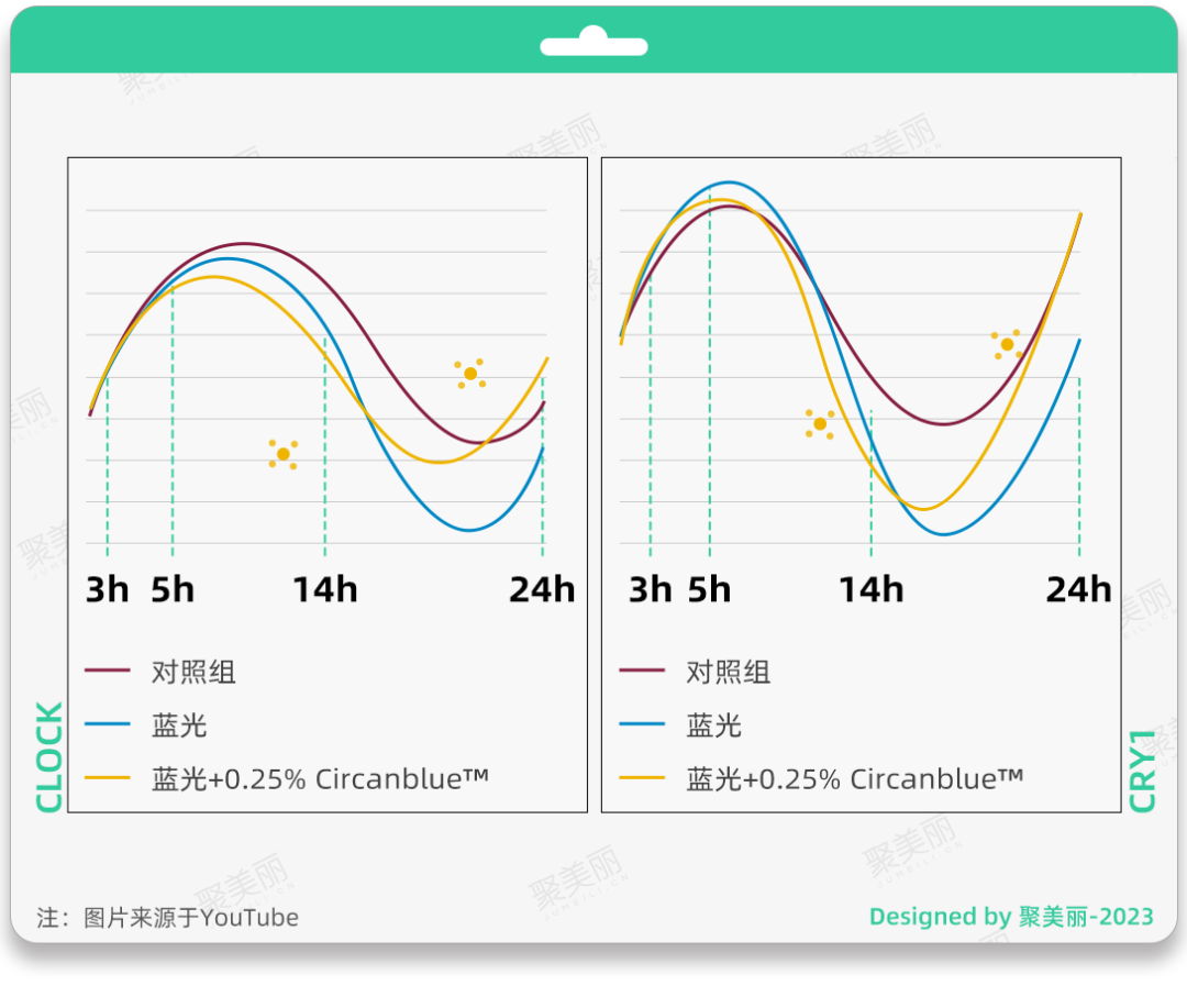 藍光測試表明,Circanblue 能夠重新同步兩個時鐘基因CLOCK和CRY1的調(diào)節(jié)水平,同時可以恢復由皮膚過度暴露于藍光引起的晝夜節(jié)律失調(diào)。