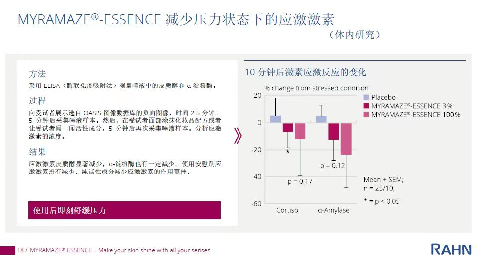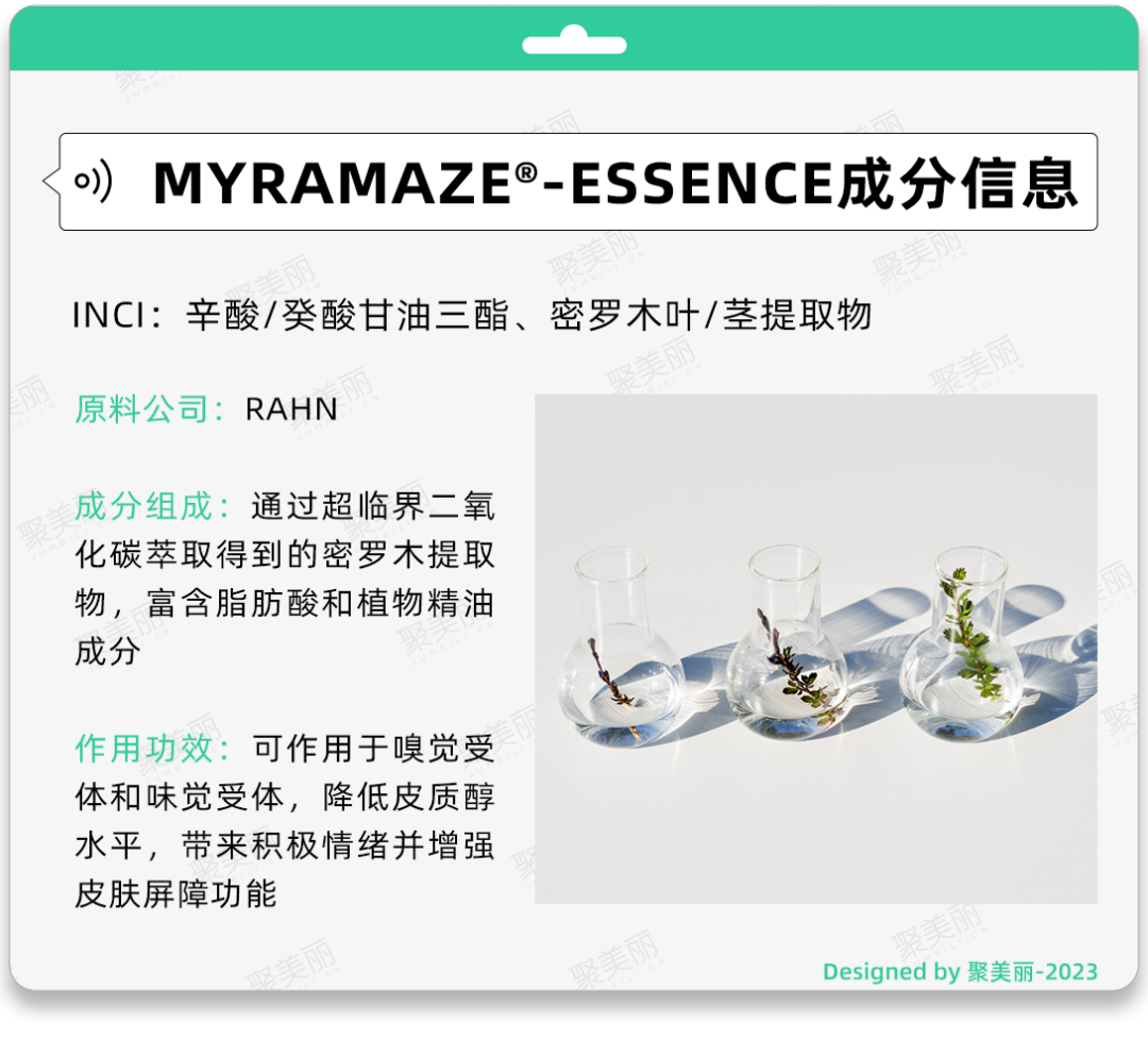 其次,MYRAMAZE -ESSENCE帶有清新的草木芳香,能夠激活鼻子的嗅覺受體。在體內(nèi)外研究中,該成分能夠減少壓力激素皮質(zhì)醇的水平,為處于壓力之下的人帶來更積極的情緒。