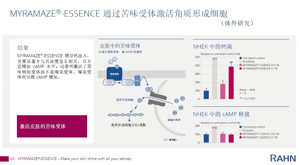 體外測試結(jié)果表明,該成分能夠同時作用于嗅覺受體和苦味受體。首先,MYRAMAZE -ESSENCE能夠誘導鈣流入,此效果與濃度呈正相關,且不會增加 CAMP(環(huán)磷酸腺苷)水平。