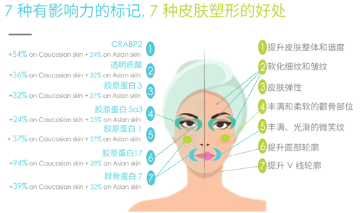 基于對基因組學的研究,亞什蘭從300個與面部塑形有關的基因中,篩選出7個民族基因組標記關鍵靶點,對面部形狀、外眼角、唇角和臉頰等部位相關的皮膚塑形效果進行了對應的研究。
