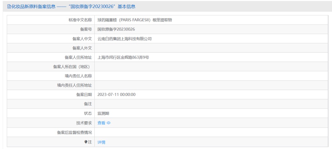 根據(jù)國家藥品監(jiān)督管理局備案信息顯示,7月份,云南白藥的首款化妝品新原料“球藥隔重樓(PARIS FARGESII)根莖提取物”成功通過備案。