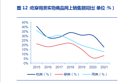 雖說電商購物已成趨勢想要不斷提高自身日活,但據(jù)wind數(shù)據(jù)顯示,自2016年至今,吃穿用類實(shí)物商品網(wǎng)上銷售額同比增速就一直在放緩。