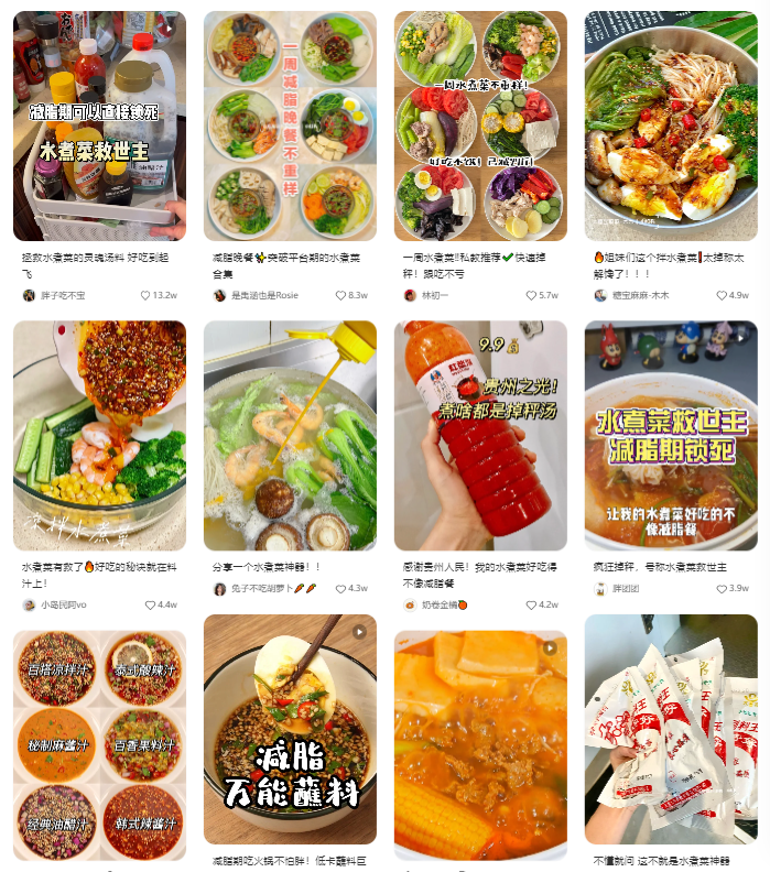 在B站、小紅書、微博等社交媒體上不同用戶都總結(jié)了經(jīng)驗(yàn),火鍋底料、味噌湯料、油醋汁、歐芹大蒜鹽等調(diào)味品各顯神通發(fā)光發(fā)熱,變身“水煮菜神器”、 “水煮菜救世主” ,讓單調(diào)的水煮菜變得有滋有味。