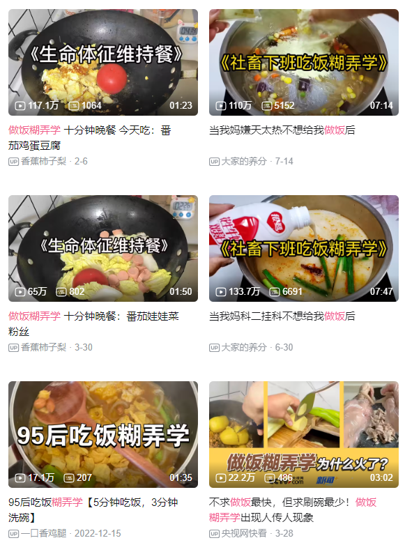前一段時(shí)間,“做飯糊弄學(xué)”視頻在小紅書、B站等平臺(tái)走紅,成了流量密碼。在“做飯糊弄學(xué)”里,做飯時(shí)盡量用剪刀處理一切食材,盡量在一個(gè)鍋內(nèi)完成所有操作。有媒體總結(jié)“做飯糊弄學(xué)”有三大基本原則:非必要不切菜、非必要不裝盤、非必要不刷鍋。