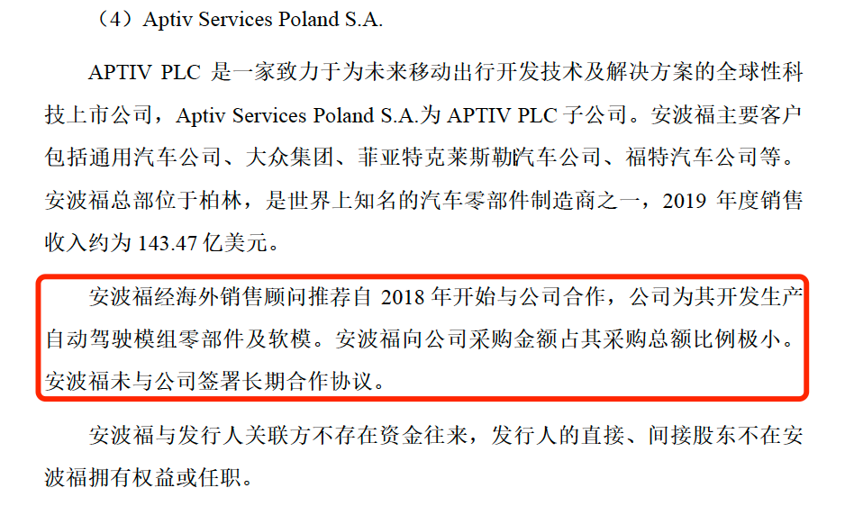 星源卓鎂招股書(shū)報(bào)告期截至2022年6月。其顯示,美股上市公司安波福為世界知名汽車(chē)零部件制造商,2018年開(kāi)始,安波福經(jīng)海外銷(xiāo)售顧問(wèn)推薦開(kāi)始與星源卓鎂合作,星源卓鎂為其開(kāi)發(fā)生產(chǎn)自動(dòng)駕駛模組零部件及軟模。安波福向公司采購(gòu)金額占其采購(gòu)總額比例極小,安波福未與公司簽署長(zhǎng)期合作協(xié)議。