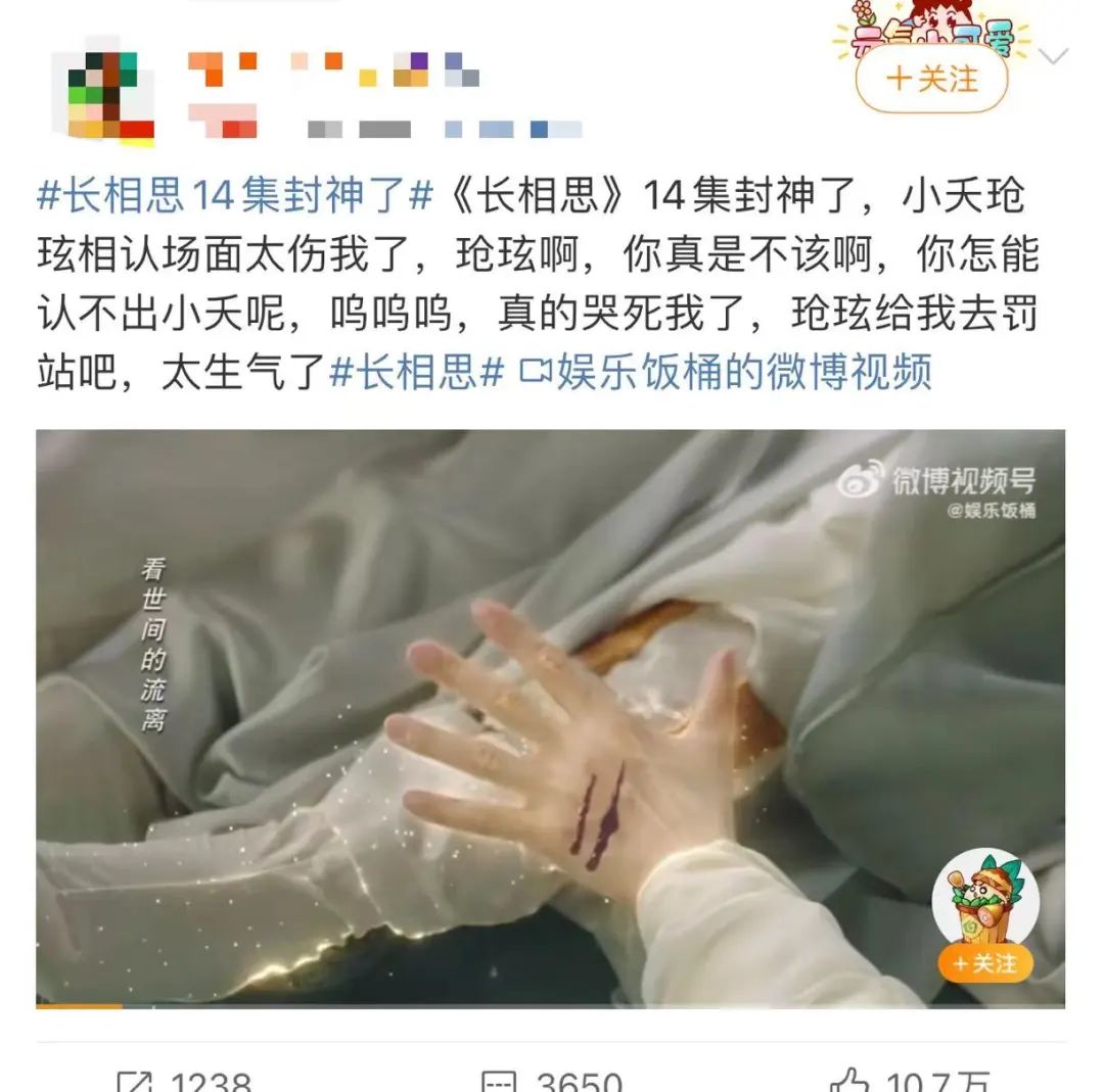 劇情里,表哥玱玹不識分別三百年的妹妹小夭,打斷了她的腿,后來得知真相,含淚運功為小夭療傷治腿。這經(jīng)典一幕自帶“骨科”雙關(guān),引得不少劇粉大呼精彩,“夭玹”CP也就此上分。當(dāng)晚“長相思14集封神了”的話題直奔熱搜榜第一。