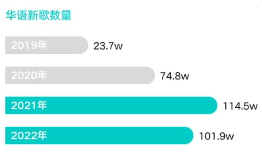 在去年,熱歌的流水線終于放慢了節(jié)奏。據(jù)《2022華語數(shù)字音樂年度白皮書》顯示,在多年增長之后首次下降,2022年華語新歌數(shù)量為101.9萬,同比2021年下降11%。