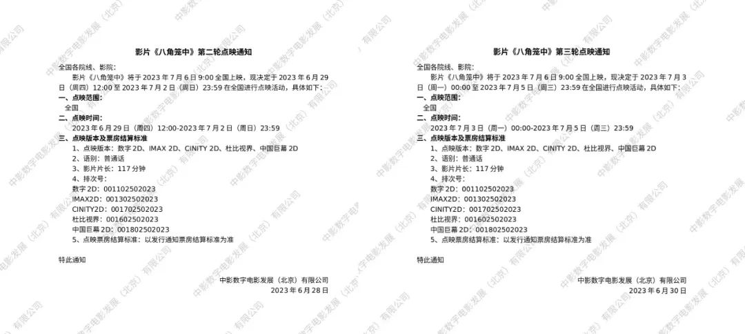 《八角籠中》一共進(jìn)行了三輪點(diǎn)映。首輪選在了端午檔6月22日-6月24日三天的14點(diǎn)-21點(diǎn),范圍及場(chǎng)次數(shù)量都沒有做限制。而隨著首輪點(diǎn)映的結(jié)束,該片又緊接著追加了兩輪更大規(guī)模的點(diǎn)映。其中二輪點(diǎn)映時(shí)間選在了6月29日12點(diǎn)-7月2日23點(diǎn)59分,三輪點(diǎn)映則是從7月3日0點(diǎn)-7月5日23點(diǎn)59分。