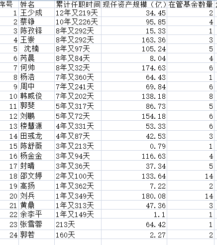 01、24位權(quán)益基金經(jīng)理一半任職5年以上,8人現(xiàn)任資產(chǎn)上百億