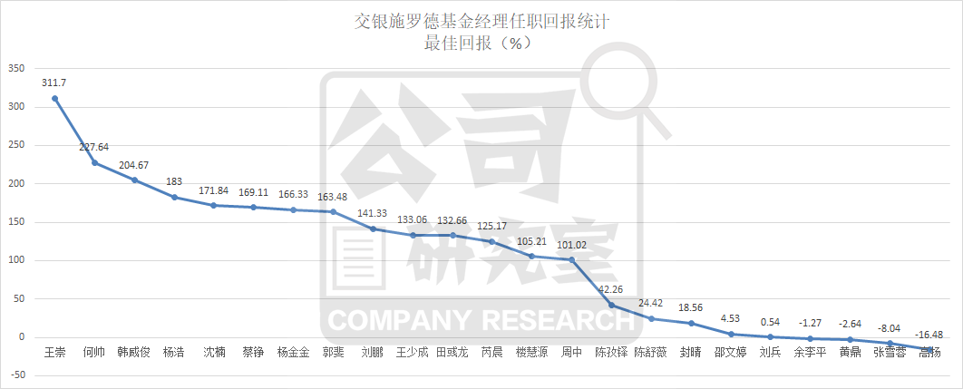 公司研究室注意到,除了王少成、楊浩最佳回報(bào)產(chǎn)品已卸任外,其余回報(bào)超過(guò)100%的基金經(jīng)理,依然在管理這些產(chǎn)品。這說(shuō)明,交銀施羅德基金經(jīng)理隊(duì)伍相對(duì)穩(wěn)定,對(duì)基民來(lái)說(shuō)這是一件好事。