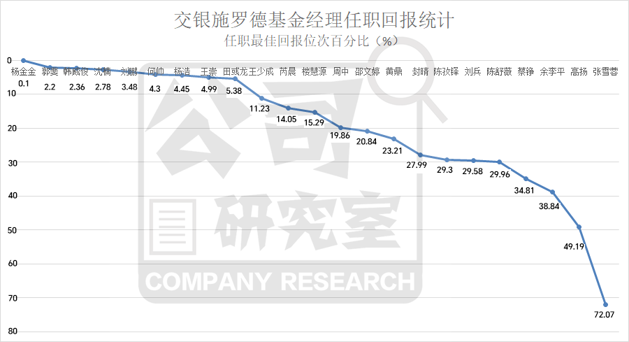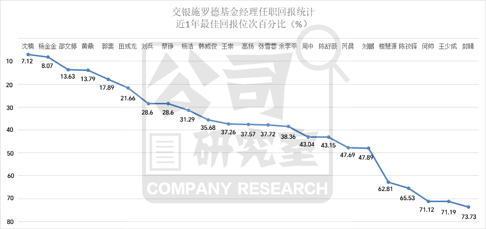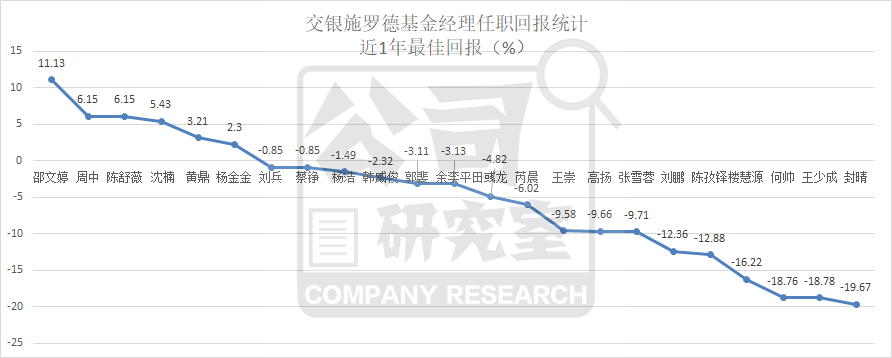 為了客觀分析交銀施羅德旗下基金經(jīng)理近1年的投資回報(bào),公司研究室特地選取23位權(quán)益基金經(jīng)理在此期間所管產(chǎn)品中回報(bào)最高的產(chǎn)品業(yè)績(jī),進(jìn)行分析比較。
