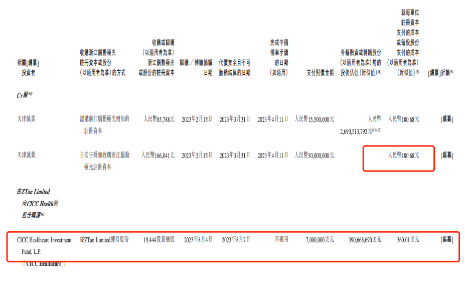 2023年8月4日,CICC Healthcare同意以現(xiàn)金代價(jià)700萬美元從ZTan Limited收購19444股普通股,投后估值約為3.91億美元,每股成本為360.01美元。