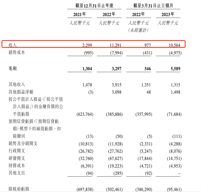 2021年、2022年度以及2023年第一季度,腦動極光的收入分別為229.9萬元、1129.1萬元和1056.4萬元,凈虧損分別為6.98億元、5.02億元和9546.1萬元。