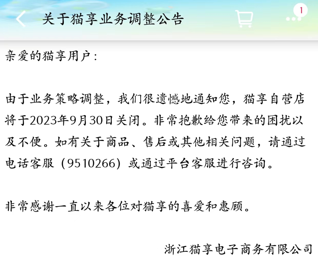 上線至今不足一年半,天貓旗下的自營(yíng)業(yè)務(wù)貓享,即被按下了暫停鍵。近日,貓享發(fā)布業(yè)務(wù)調(diào)整公告,將于今年9月30日關(guān)閉。