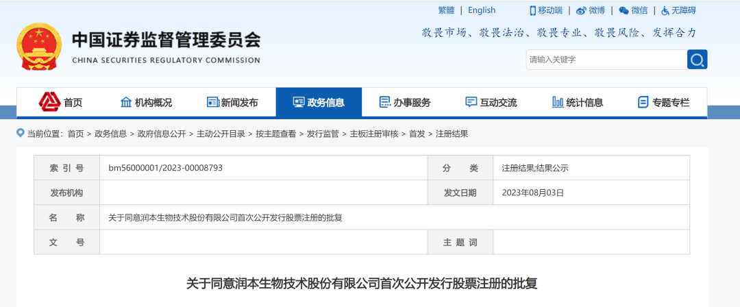 8月3日,中國(guó)證券監(jiān)督管理委員會(huì)發(fā)布《關(guān)于同意潤(rùn)本生物技術(shù)股份有限公司首次公開發(fā)行股票注冊(cè)的批復(fù)》。證監(jiān)會(huì)稱,已收到上交所報(bào)送的關(guān)于潤(rùn)本生物技術(shù)股份有限公司首次公開發(fā)行股票并在主板上市的審核意見及公司注冊(cè)申請(qǐng)文件。