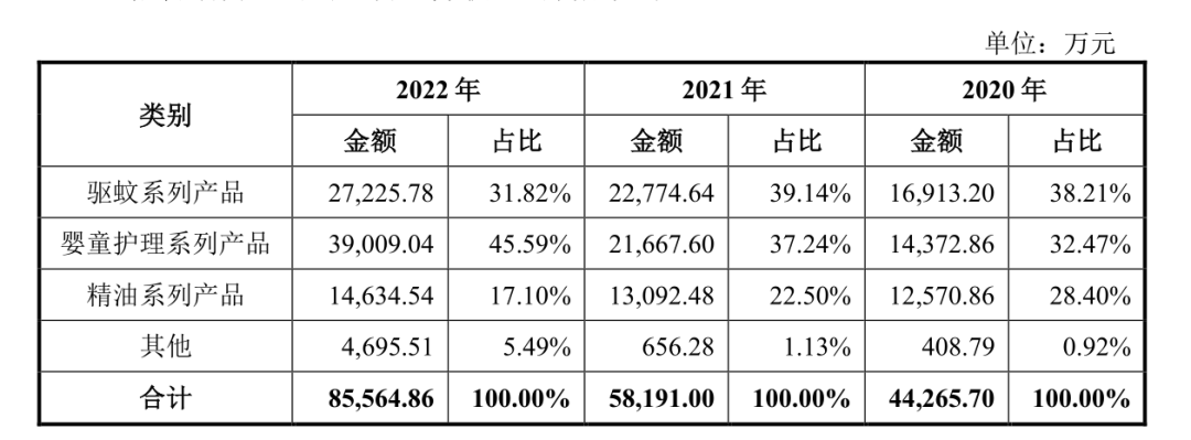 然而,嬰童護(hù)理板塊在潤(rùn)本謀劃上市的幾年間早已“異軍突起”。2020年到2022年,品類年銷售金額分別為14,373萬(wàn)元、21,668萬(wàn)元和39,009萬(wàn)元。其占主營(yíng)業(yè)務(wù)收入的比例也逐年上升:2020年為32.47%,2021年為37.24%,2022年上升為45.59%,已正式超越驅(qū)蚊板塊成為潤(rùn)本的第一收入來(lái)源。