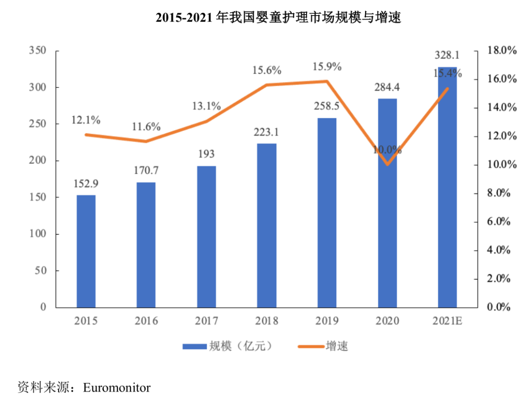 我國(guó)嬰童護(hù)理市場(chǎng)的規(guī)模不斷擴(kuò)大。根據(jù)Euromonitor的數(shù)據(jù),2015年相關(guān)市場(chǎng)規(guī)模為152.9億元,2021年增長(zhǎng)為328.1億元。即便人口出生率有降低的趨勢(shì),由于育兒精細(xì)化趨勢(shì)和對(duì)下沉市場(chǎng)的教育,嬰童護(hù)理的年增速仍保持在10%以上。