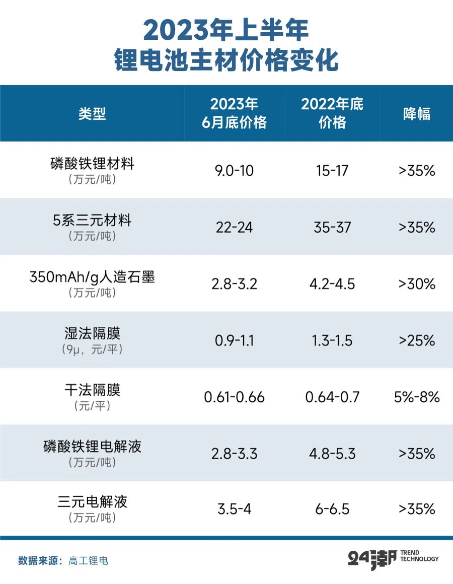 事實(shí)上,2023年上半年,受原材料價(jià)格劇烈波動(dòng)、市場(chǎng)供需變化等因素影響,鋰電池核心主材價(jià)格均出現(xiàn)不同程度下降。據(jù)高工鋰電統(tǒng)計(jì),截至2023年6月,正極材料、電解液價(jià)格較上一年年底下滑超35%,負(fù)極價(jià)格下滑超30%。受隔膜產(chǎn)品技術(shù)路線轉(zhuǎn)換以及市場(chǎng)競(jìng)價(jià)影響,濕法隔膜價(jià)格下滑超25%,干法隔膜價(jià)格降幅在5-8%。