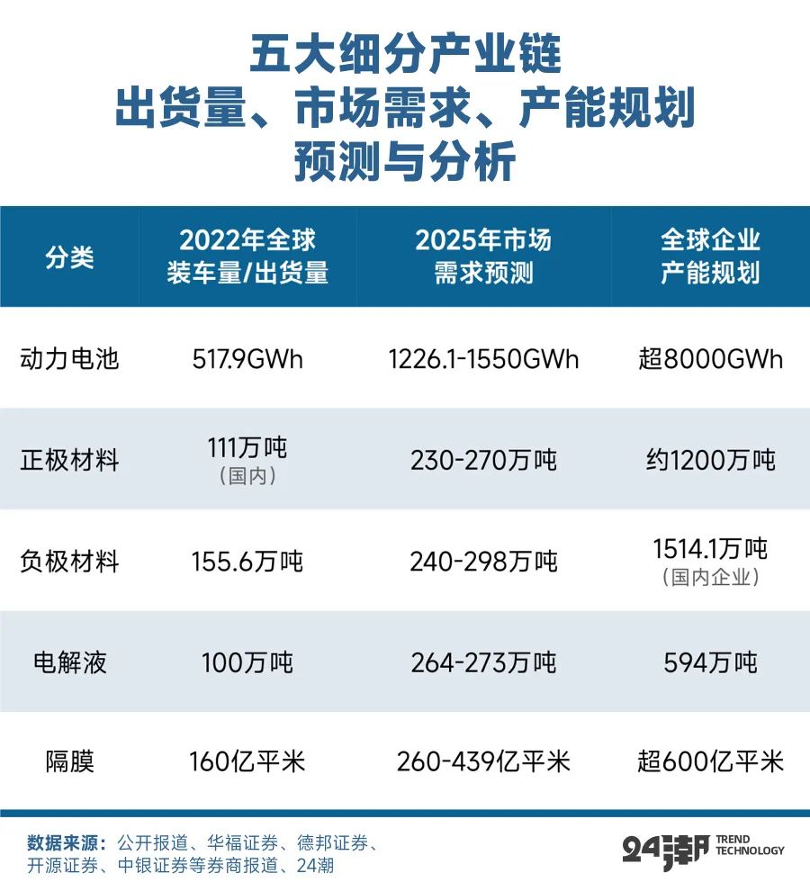 首先看24潮團(tuán)隊(duì)統(tǒng)計(jì)的一組數(shù)據(jù):截止目前,在動(dòng)力電池、正極材料、負(fù)極材料、電解液與鋰電隔膜這5大細(xì)分產(chǎn)業(yè)鏈中,企業(yè)產(chǎn)能規(guī)劃均遠(yuǎn)超2025年第三方研究機(jī)構(gòu)對(duì)市場(chǎng)需求預(yù)測(cè)上限,目前很多核心產(chǎn)業(yè)鏈已隱現(xiàn)產(chǎn)能過剩風(fēng)險(xiǎn)與壓力,未來三年內(nèi)出現(xiàn)嚴(yán)重產(chǎn)能過剩似乎已經(jīng)不可避免。