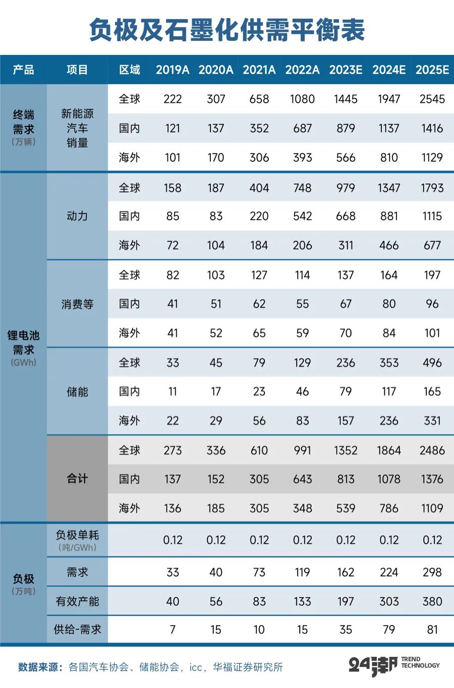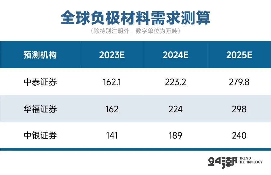 綜合券商分析預(yù)測(cè),未來幾年負(fù)極材料保持增長(zhǎng)趨勢(shì)是大概率事情,預(yù)計(jì)到2025年全球負(fù)極材料需求在240-298萬噸。
