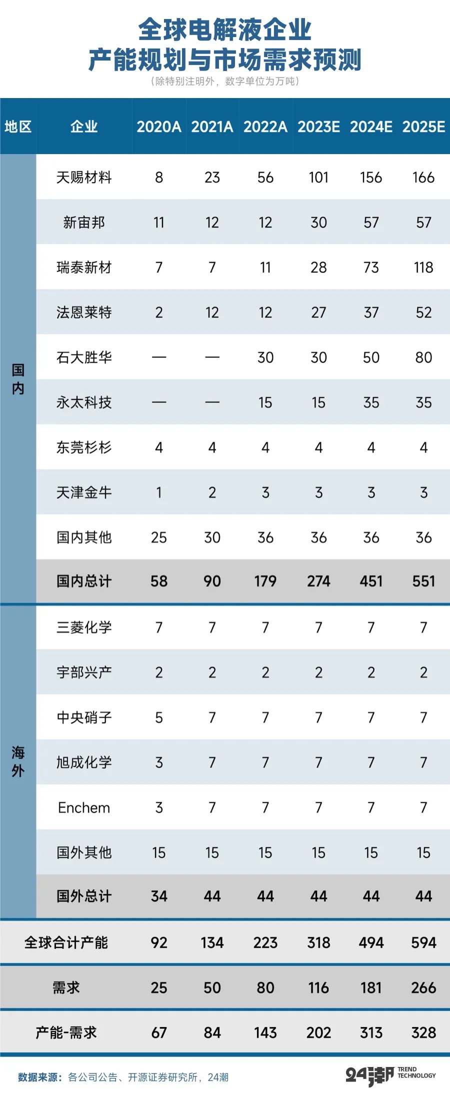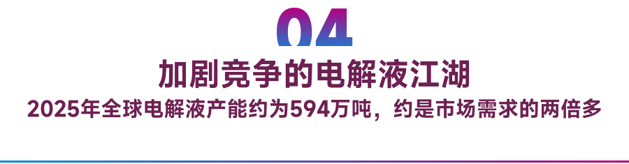 但回歸企業(yè)層面,未來產(chǎn)業(yè)競(jìng)爭(zhēng)加劇已是必然。比如據(jù)開源證券統(tǒng)計(jì),預(yù)計(jì)到2025年全球電解液產(chǎn)能約為594萬噸,遠(yuǎn)超上述需求預(yù)測(cè)。