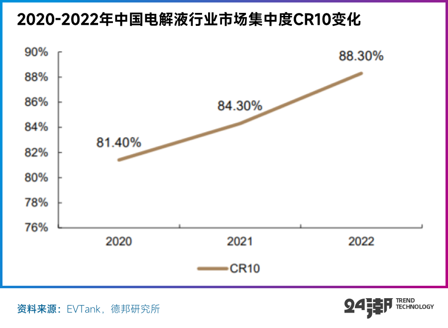 根據(jù)EVTank統(tǒng)計(jì),2020年-2022年中國電解液行業(yè)CR10市場(chǎng)份額占比分別為81.40%、84.30%、88.30%,行業(yè)集中度持續(xù)提升。主要原因有:第一,電解液產(chǎn)品定制化程度高,龍頭企業(yè)技術(shù)先進(jìn),更容易綁定下游優(yōu)質(zhì)客戶,并享受客戶擴(kuò)張帶來的紅利;第二,規(guī)模大的企業(yè)往往有較深的一體化布局,規(guī)模效應(yīng)與優(yōu)勢(shì)更加顯著,應(yīng)對(duì)上游原材料價(jià)格波動(dòng)的能力更強(qiáng)。