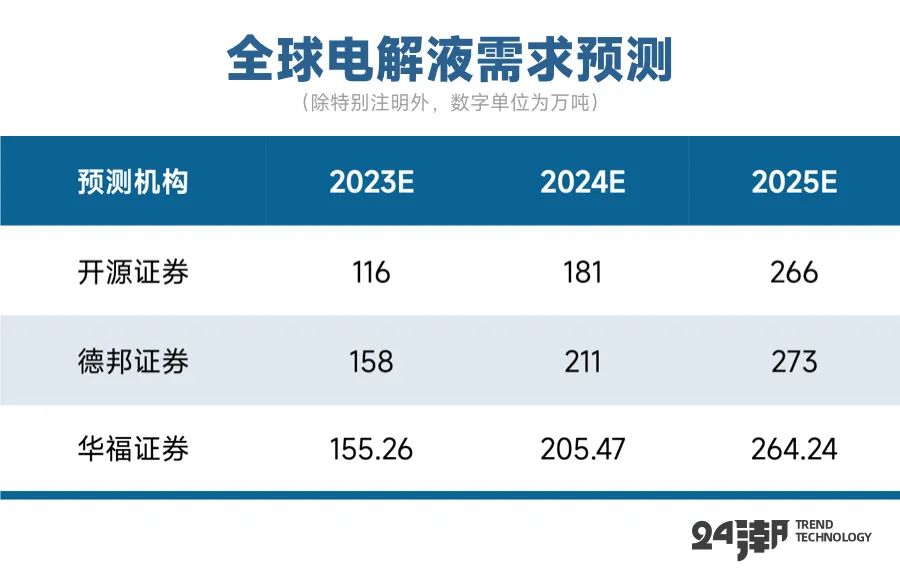 從產(chǎn)業(yè)趨勢(shì)看,未來電解液市場(chǎng)需求還將保持增長(zhǎng)趨勢(shì),綜合券商分析預(yù)測(cè),2025年全球電解液需求約為264-273萬噸。