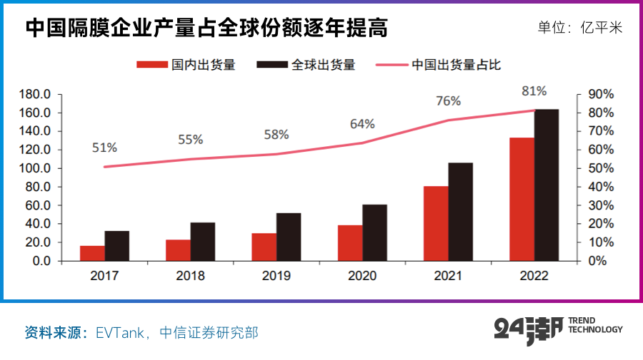 根據(jù) EVTank數(shù)據(jù)顯示,2022年,2022年全球鋰離子電池隔膜出貨量已經(jīng)突破160億平米,中國企業(yè)鋰電隔膜出貨量占全球比例突破80%,標(biāo)志著隔膜行業(yè)已經(jīng)基本完成國產(chǎn)替代,正在走向全球替代。