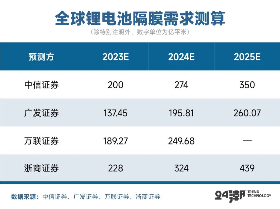 在新能源產(chǎn)業(yè)崛起的大勢(shì)下,鋰電隔膜需求量未來幾年大概率仍將保持增長(zhǎng)趨勢(shì),綜合中信證券、浙商證券、廣發(fā)證券等券商分析2025年全球鋰電池隔膜需求約為260-439億平米。