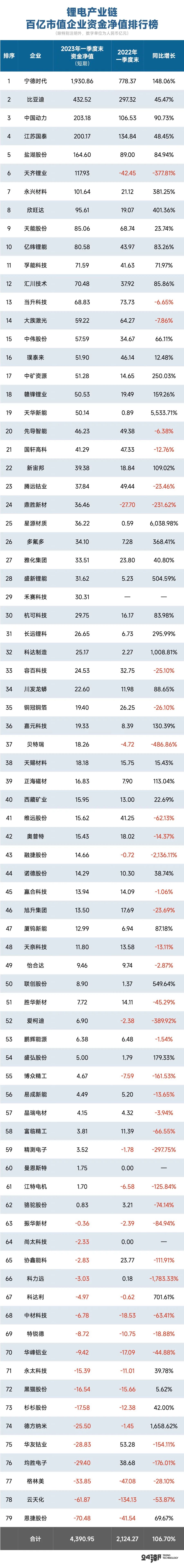 據(jù)24潮團(tuán)隊(duì)統(tǒng)計(jì),截止2023年一季度末,79家動(dòng)力電池產(chǎn)業(yè)鏈上市公司資金凈值(資金儲(chǔ)備-短期有息債務(wù))合計(jì)為4390.95億元,同比增長(zhǎng)106.70%,但資金大多掌握在少數(shù)巨頭手中,其中前十名企業(yè)資金凈值合計(jì)為3412.15億元,占比達(dá)77.71%。
