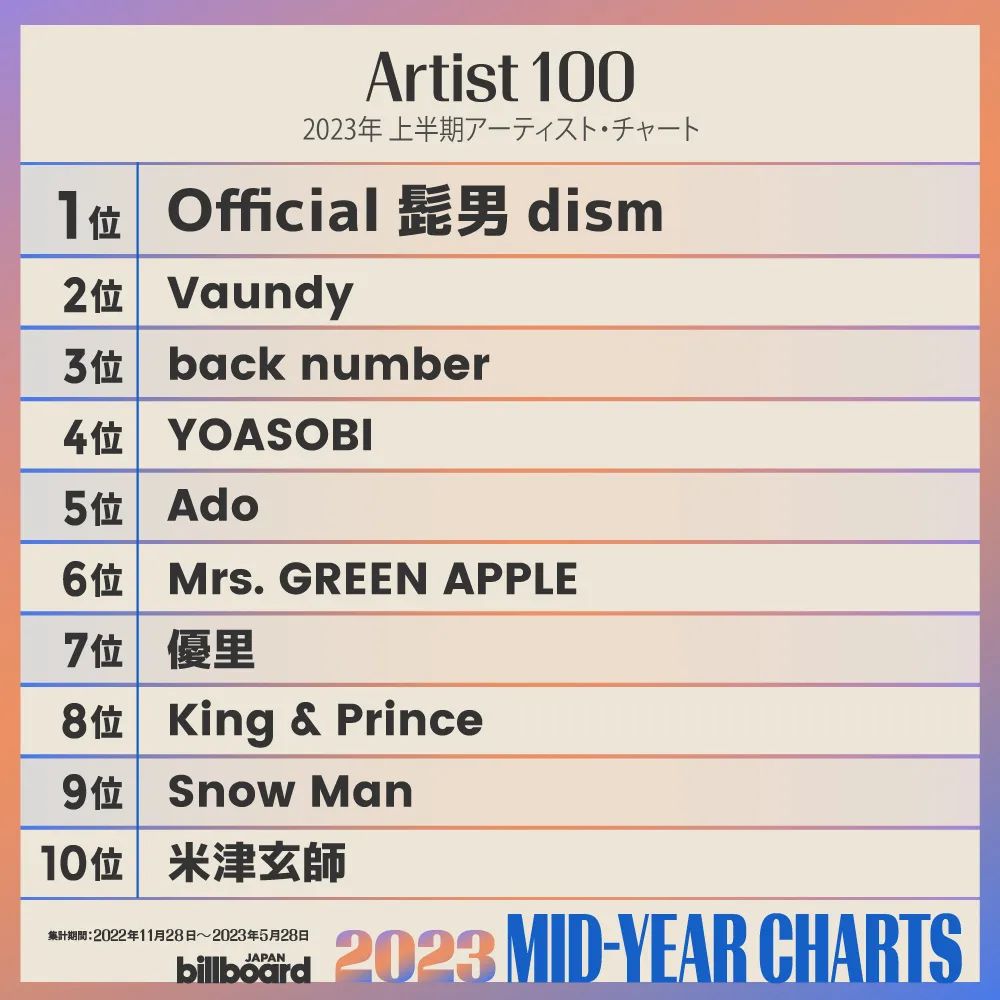 圖注:Billboard-JAPAN-2023上半年TOP-Artists