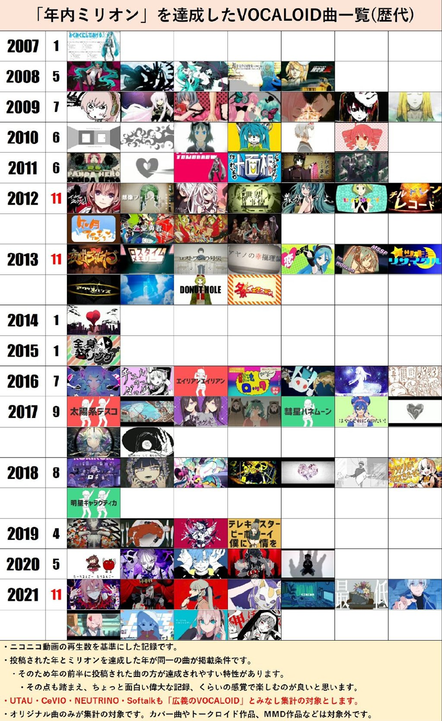 在Vocaloid誕生初期,經(jīng)由音樂愛好者的大浪淘沙,質量高的歌曲自能脫穎而出,播放量也會水漲船高。在NICONICO播放量達到一百萬的歌曲被稱為“傳說曲”,2008-2013年傳說曲的數(shù)量逐年攀升。
