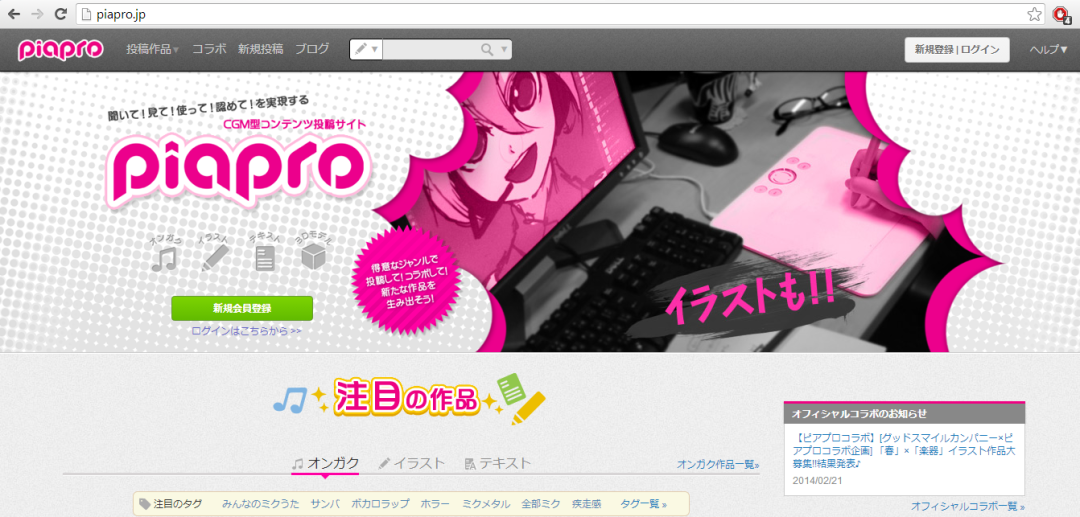 2007年,初音未來推出后掀起了一股二創(chuàng)風潮,大量同人作品開始涌現(xiàn),亦衍生出許多關于虛擬偶像的版權使用問題。為此,C社專門設立了一個創(chuàng)作分享網(wǎng)絡平臺Piapro(Peer Production的縮寫),希望在這里“擁有各式各樣知識與特長的朋友們可以共同分享和創(chuàng)造信息”,并支持音樂、文字、圖片、視頻、3D模型等內(nèi)容的發(fā)布。
