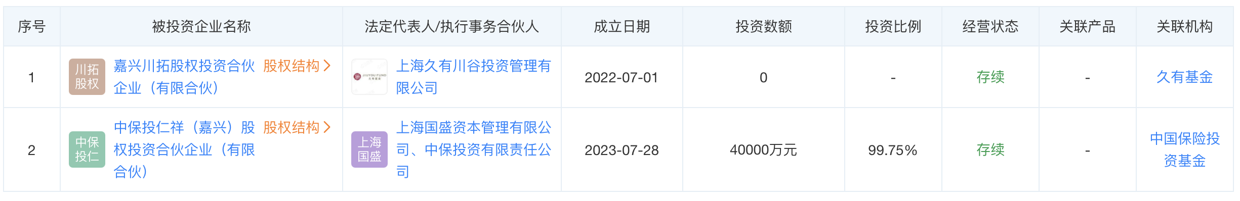 其中一家基金為嘉興川拓股權投資合伙企業(yè)(有限合伙),背后管理人為久有基金,另一家基金為中保投仁祥(嘉興)股權投資合伙企業(yè)(有限合伙),背后管理人為中保投資。兩支基金均已完成備案,注冊地都為浙江省嘉興市。