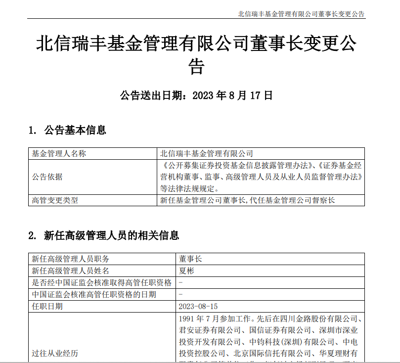 原副總經(jīng)理王乃力代任總經(jīng)理,他1996 年 9 月參加工作,曾任北方證券有限公司營(yíng)業(yè)部副經(jīng)理、鵬華基金北京分公司總經(jīng)理助理、國(guó)泰基金零售業(yè)務(wù)部總監(jiān)兼北京分公司總經(jīng)理、招商基金機(jī)構(gòu)業(yè)務(wù)部總監(jiān),2021年12 月加入北信瑞豐。
