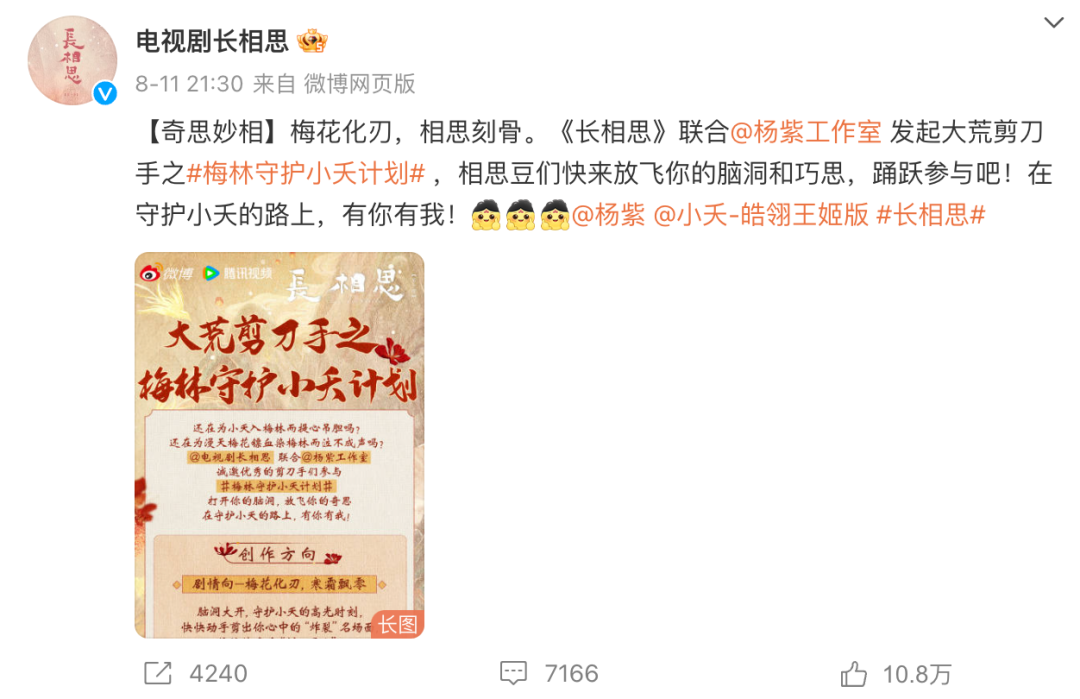 “你真是最聽勸的劇方?!痹谛寂c楊紫工作室合作,聯(lián)合發(fā)起話題詞為“梅林守護(hù)小夭”二創(chuàng)計(jì)劃后,電視劇《長(zhǎng)相思》的官微底下聚集了大量此類評(píng)論。