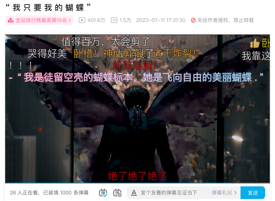 首先是單人角色剪輯,這是目前最主流的二創(chuàng)內(nèi)容。通常用戶會(huì)圍繞熱播劇集的某一角色,進(jìn)行二次創(chuàng)作。比如此前在B站創(chuàng)造多條百萬播放東方青蒼角色剪輯,以及最新的例子——孟宴臣的角色剪輯。